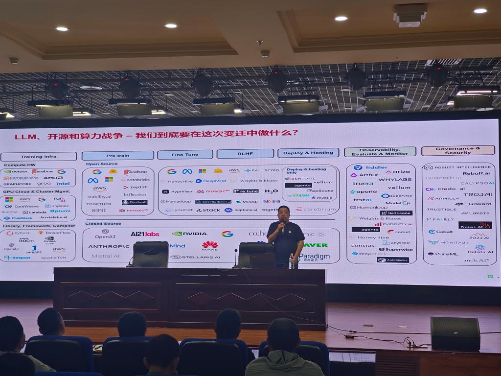 公司兼职教授陈辉、牛征曌共同以《人工智能-大语言模型趋势及应用》为题,进行了学术讲座。从人工智能的概念和走向、影响AI大模型发展的关键因素、大模型的应用、大模型重构产业的竞争力等方面进行了研究分享,为参会员工进行了生动的学术报告。