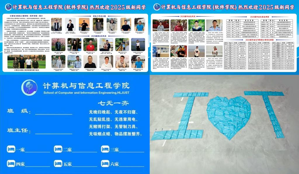 “悉心”布置,营造温馨入学氛围。一是营造欢迎氛围,悬挂迎新寄语条幅,布置多块太阳成集团tyc33455简介、团队力量及优秀毕业生风采展板,帮助新生及家长直观了解学院整体情况。微信公众号计划推出迎新进行时系列推文10余篇,帮助新生顺利完成从高中生到老员工的角色转变。二是规范宿舍管理,为所有寝室设计并张贴统一创意门贴,清晰标注院徽、住宿人员信息及管理规范,为后续宿舍安全、卫生及日常检查工作奠定基础。三是贴心准备物资,定制389份新生入学指南档案袋,内置报到所需碳素笔、入住单、体检单及校徽等物品,以细致入微的关怀让新生感受到学院的温暖。