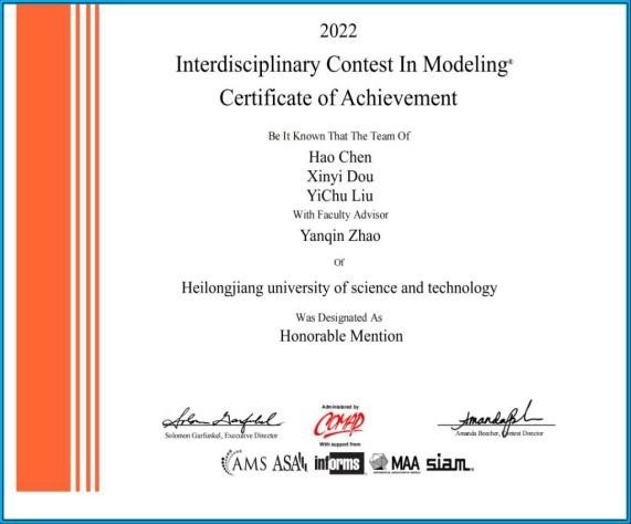 主要获得了2022和2023年美国老员工国际数学建模竞赛国际一等奖(Meritorious)3项,国际二等奖(Honourable Metion)7项。