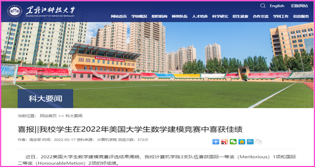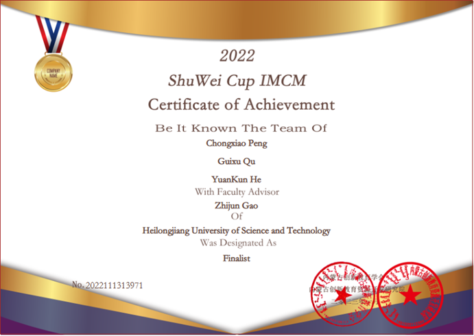2021和2022年“数维杯”国际老员工数学建模挑战赛提名奖(Finalist)2项、国际赛一等奖(Meritorious)4项、国际赛二等奖(Honourable Metion)9项。