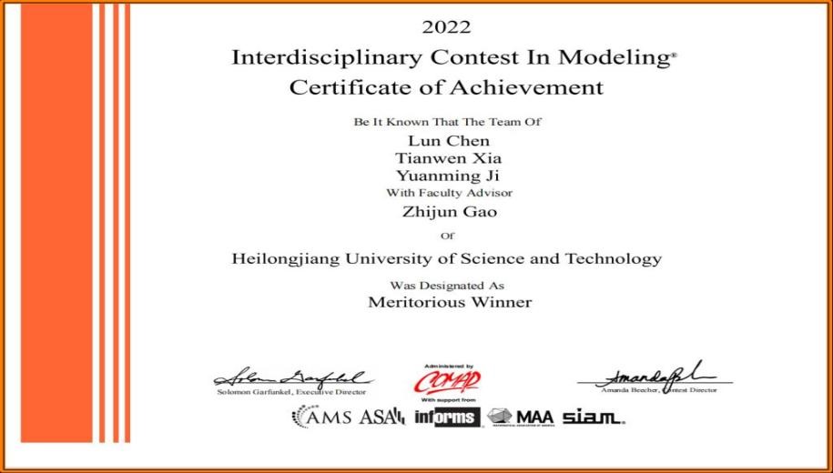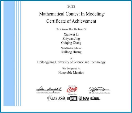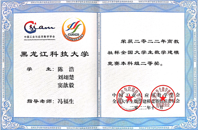2021和2022年东三省数学建模联赛获省一等奖6项;2022年MathorCup数学建模挑战赛全国二等奖2项,全国三等奖3项;2022年钉钉杯全国老员工数据分析竞赛全国二等奖5项。